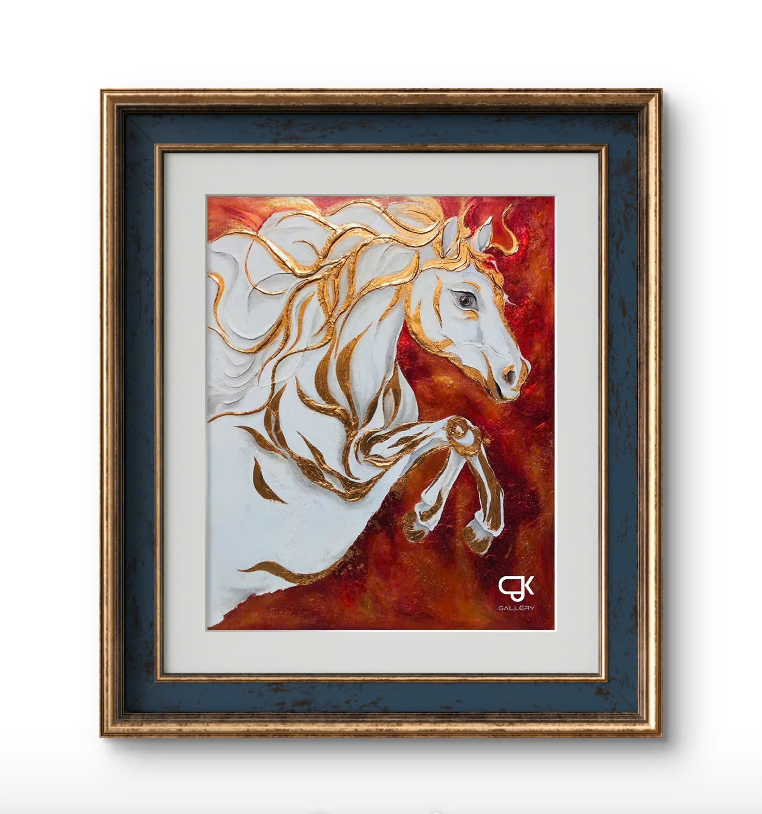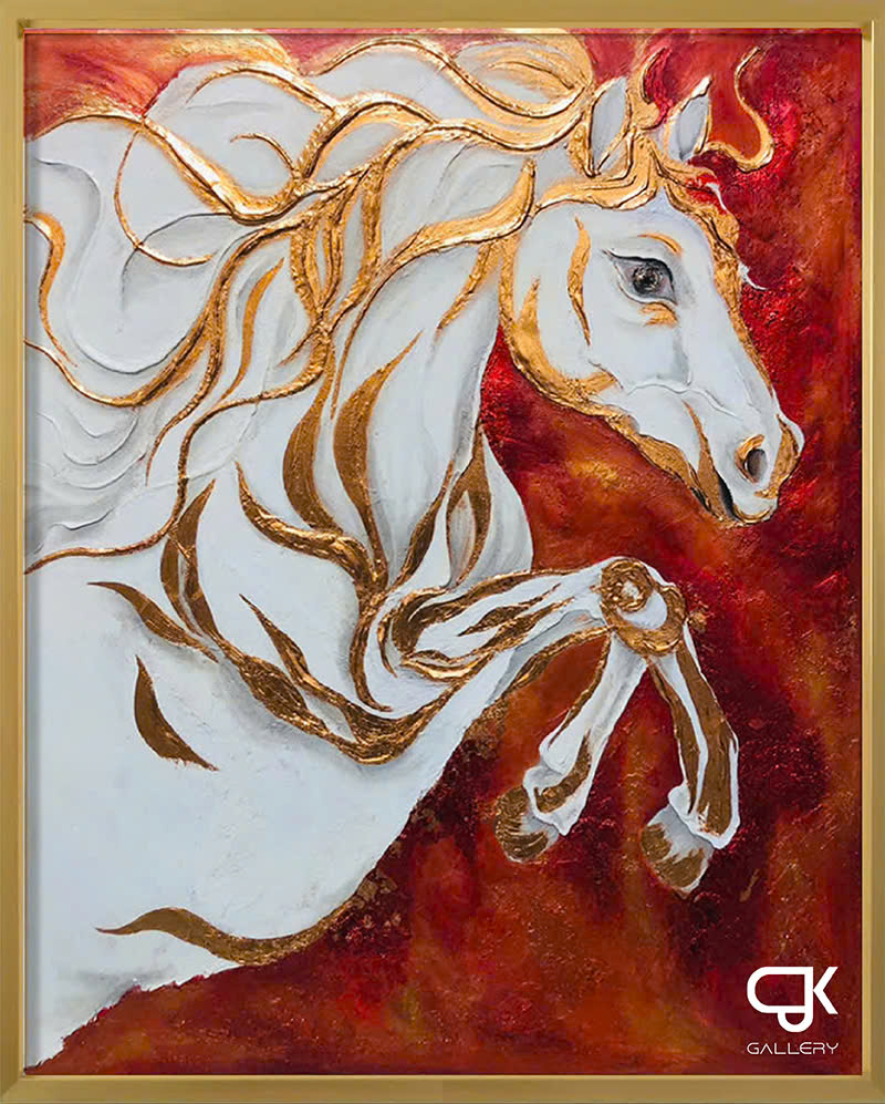 Hình tượng ngựa được thể hiện trong trạng thái tĩnh động – thân hình căng tràn năng lượng nhưng chưa phóng đi. Các đường nét uốn lượn mềm mại kết hợp cùng mảng màu đỏ trầm tạo nên cảm giác dồn nén, tập trung và kiểm soát.