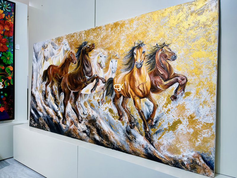 Leading the Way is inspired by the traditional concept of Ma Dao Thanh Cong (Victory Upon Arrival), reinterpreted through a contemporary visual language using textured techniques combined with acrylic and gold leaf on canvas.