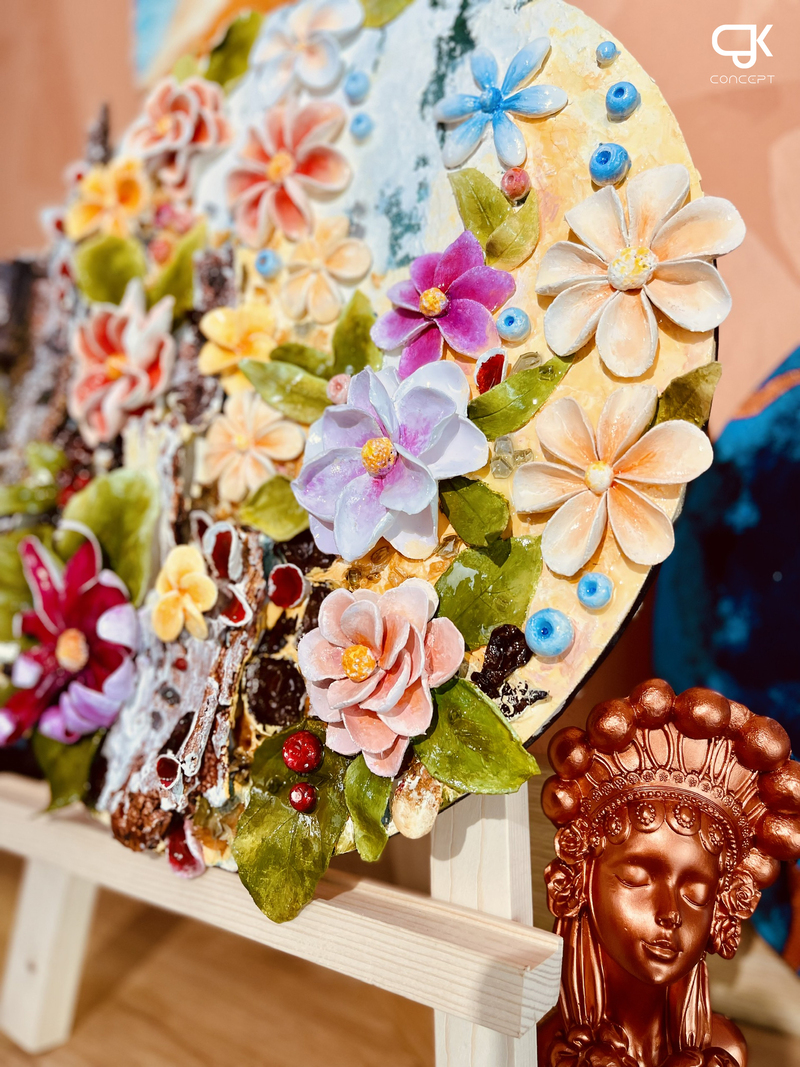 Vũ Khúc Hoa Xuân là bản giao hưởng của sắc màu và kết cấu – nơi hoa lá không chỉ “nở” trên bề mặt, mà còn “nhảy múa” bằng chiều sâu vật lý. Sử dụng kỹ thuật phối hợp nhiều chất liệu: hoa gốm tạo hình lập thể, nền acrylic vẽ tay và hiệu ứng resin phủ bóng tạo chiều sâu, tác phẩm khiến người xem như lạc vào khu vườn kỳ ảo.