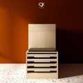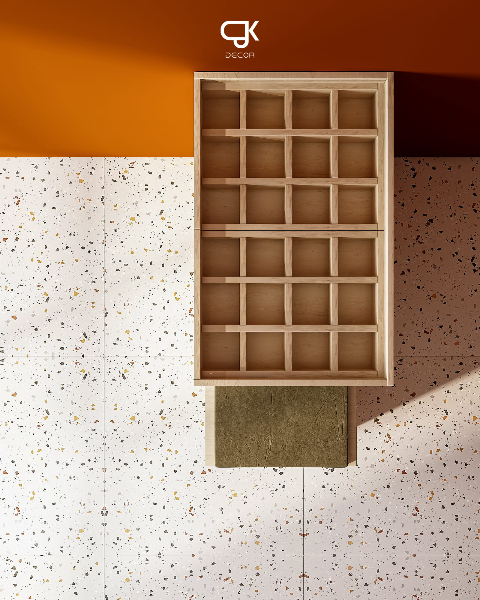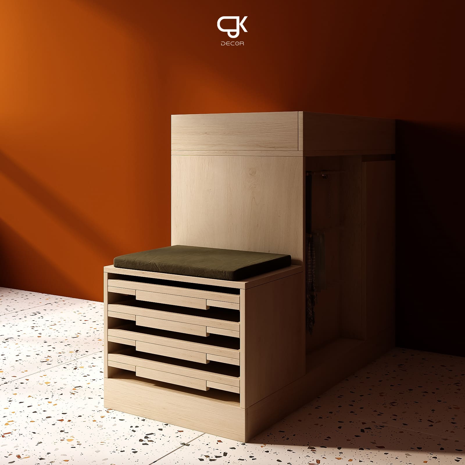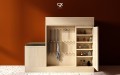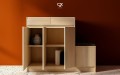 Hệ pegboard gỗ rộng cho phép treo cà vạt – thắt lưng – khăn; các tầng kệ mở sau cánh tủ dành cho nước hoa; trong khi module ngăn kéo phía ghế ngồi giúp phân loại kính, đồng hồ, nhẫn hoặc vật nhỏ. Ghế tích hợp đệm tạo sự thoải mái khi sử dụng và đóng vai trò như một module lưu trữ mở rộng.