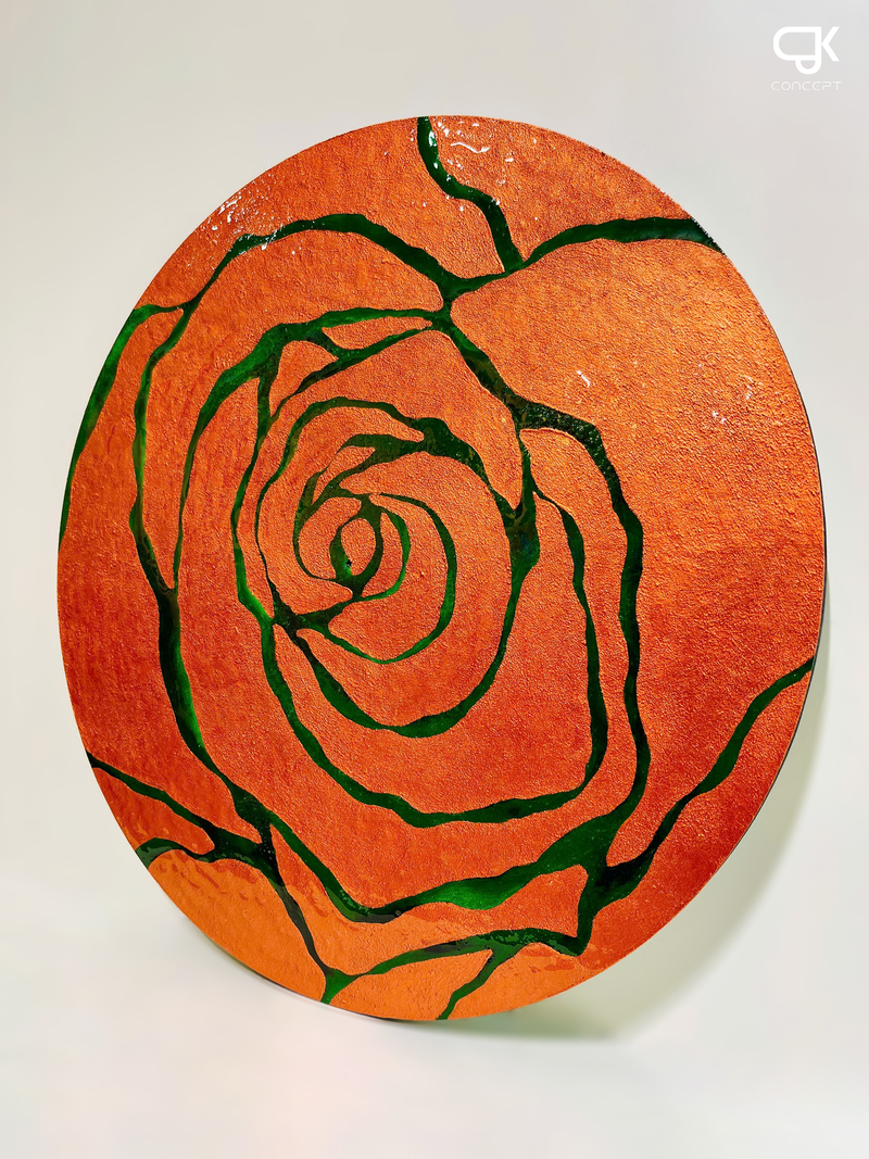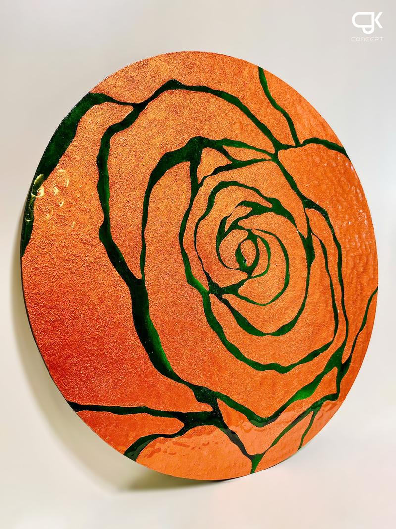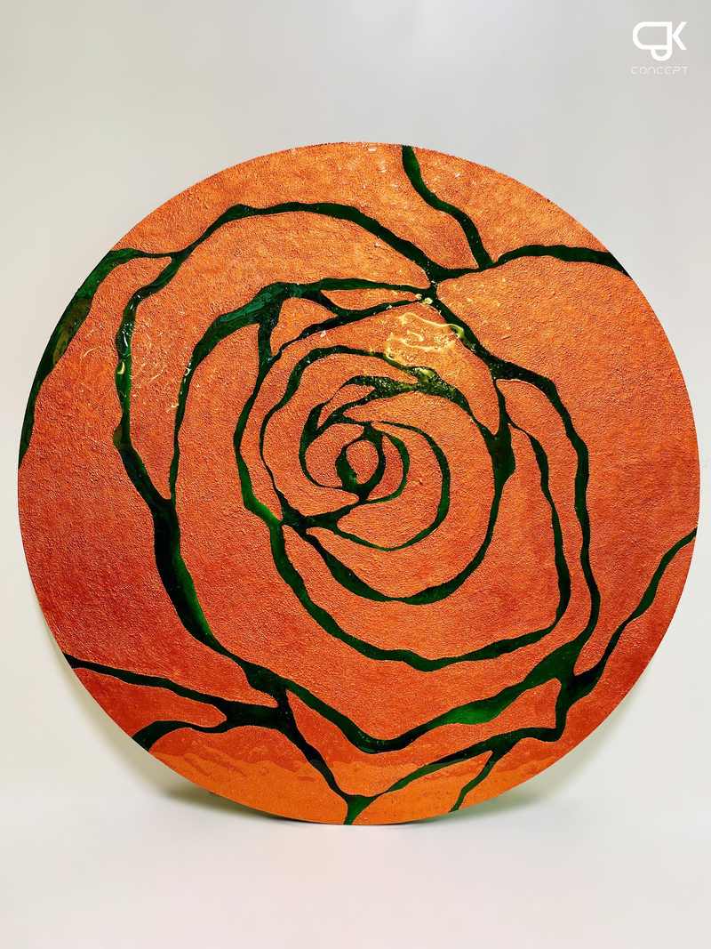 Dấu Hoa là bản giao hưởng của sự tối giản hiện đại và tính biểu tượng. Với tông cam ánh kim mạnh mẽ làm nền, những đường viền hoa màu xanh lá cây như được khắc họa bằng ánh sáng, tạo thành hình ảnh một đóa hồng cách điệu mang tính biểu trưng.