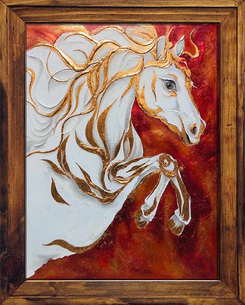 Hình tượng ngựa được thể hiện trong trạng thái tĩnh động – thân hình căng tràn năng lượng nhưng chưa phóng đi. Các đường nét uốn lượn mềm mại kết hợp cùng mảng màu đỏ trầm tạo nên cảm giác dồn nén, tập trung và kiểm soát.