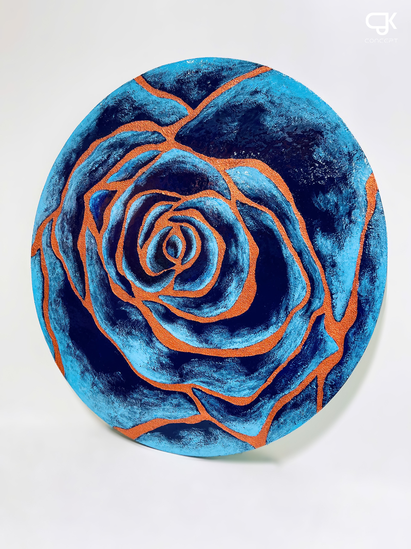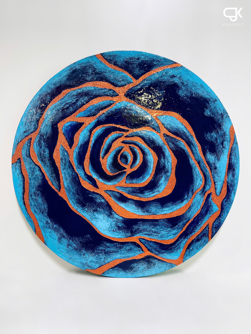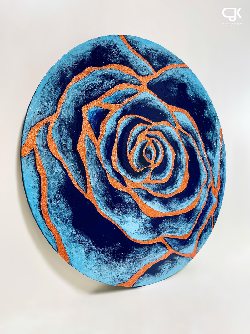 In Azure Dream, the flower appears as an abstract engraving against a night-sky backdrop — rendered in radiant blue with glowing metallic outlines. The piece evokes a cosmic harmony between nature and the universe, where softness meets strength through bold color contrasts.
