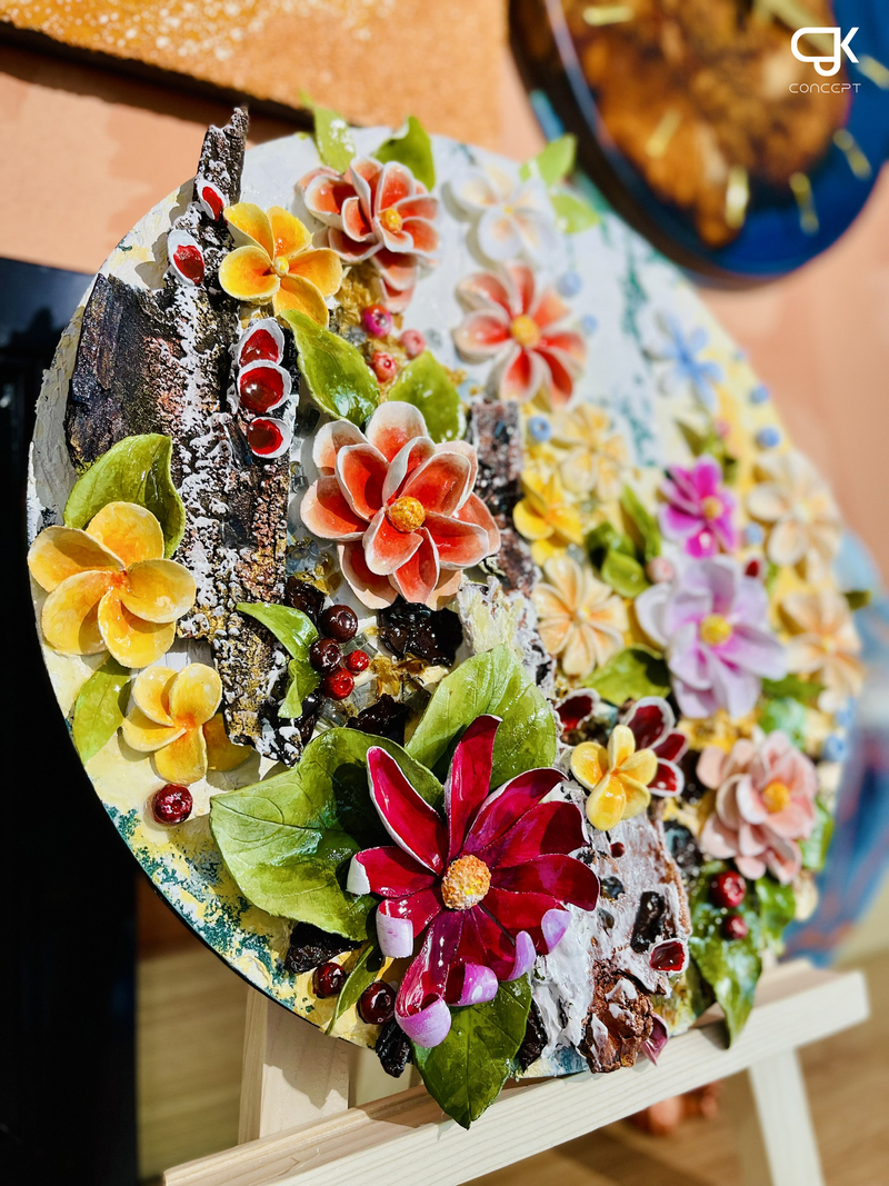 Vũ Khúc Hoa Xuân là bản giao hưởng của sắc màu và kết cấu – nơi hoa lá không chỉ “nở” trên bề mặt, mà còn “nhảy múa” bằng chiều sâu vật lý. Sử dụng kỹ thuật phối hợp nhiều chất liệu: hoa gốm tạo hình lập thể, nền acrylic vẽ tay và hiệu ứng resin phủ bóng tạo chiều sâu, tác phẩm khiến người xem như lạc vào khu vườn kỳ ảo.